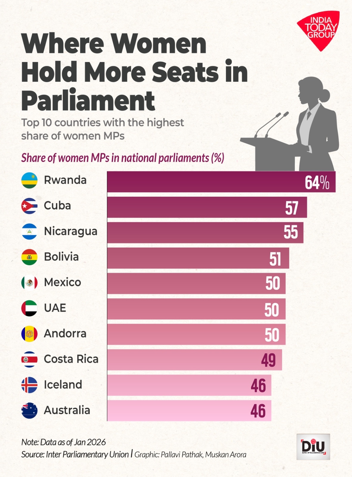 वैश्विक स्तर पर कुछ देश महिलाओं को संसद में समान अधिकार देने की दिशा में बहुत अच्छा काम कर रहे हैं। रवांडा सबसे अधिक हिस्सेदारी के साथ आगे है, जहां महिलाओं के पास लगभग 64 प्रतिशत सीटें हैं। क्यूबा और निकारागुआ जैसे अन्य देशों ने भी मजबूत भागीदारी दिखाई है, जिनमें आधी से अधिक सीटें महिलाओं के पास हैं।