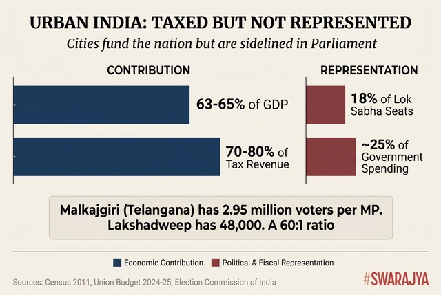 शहरी भारत राष्ट्रीय सकल घरेलू उत्पाद और कर राजस्व का बड़ा हिस्सा उत्पन्न करता है, फिर भी संसदीय सीटों का एक अंश रखता है। तेलंगाना में मल्काजगिरी में प्रति सांसद 2.95 मिलियन मतदाता हैं; लक्षद्वीप में 48,000 – 60:1 का अनुपात है जिसे कोई भी अन्य प्रमुख लोकतंत्र बर्दाश्त नहीं करेगा।