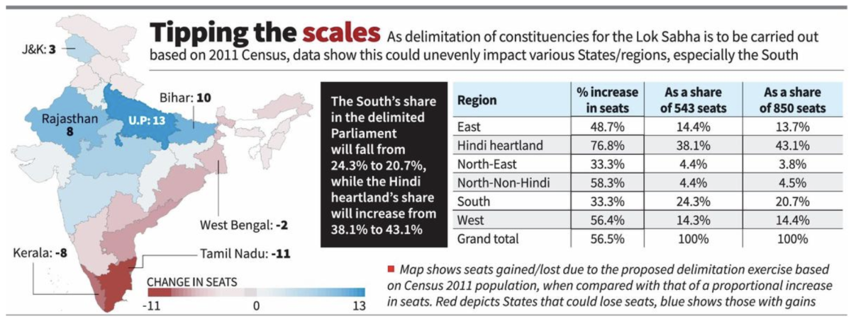 यूपी, बिहार, मध्य प्रदेश, राजस्थान, हरियाणा, छत्तीसगढ़, उत्तराखंड और दिल्ली की 543 में से 207 सीटें हैं। उन्हें 77% की बढ़ोतरी के साथ 336 सीटें मिलेंगी। सीटों में उनकी हिस्सेदारी 38.1% से बढ़कर 43.1% हो जाएगी। दक्षिण भारतीय राज्यों – तमिलनाडु, कर्नाटक, कर्नाटक, आंध्र प्रदेश, तेलंगाना, केरल और पुडुचेरी – में वर्तमान में 132 सीटें हैं, उन्हें केवल 176 सीटें मिलेंगी, जो 33% की वृद्धि है। पूर्वी राज्य 14.4% से घटकर 13.7% और उत्तर-पूर्व के राज्य 4.4% से घटकर 3.8% रह जायेंगे। पश्चिम और उत्तरी गैर-हिन्दी क्षेत्र कमोबेश वैसे ही रहेंगे, द हिंदू मानता है.