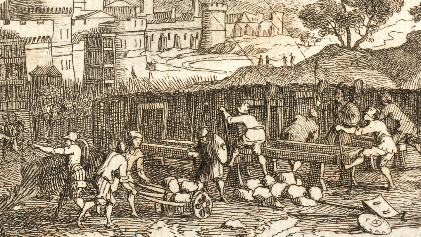 बुलेट एक प्राचीन स्लिंग प्रोजेक्टाइल है जिसे हिप्पोस में एक ताना देने वाले शिलालेख के साथ खोजा गया था। ऊपर, यूनानी घेराबंदी की एक सामान्य छवि दिखाई गई है। (यूनिवर्सल हिस्ट्री आर्काइव/यूनिवर्सल इमेजेज ग्रुप गेटी इमेजेज के माध्यम से)