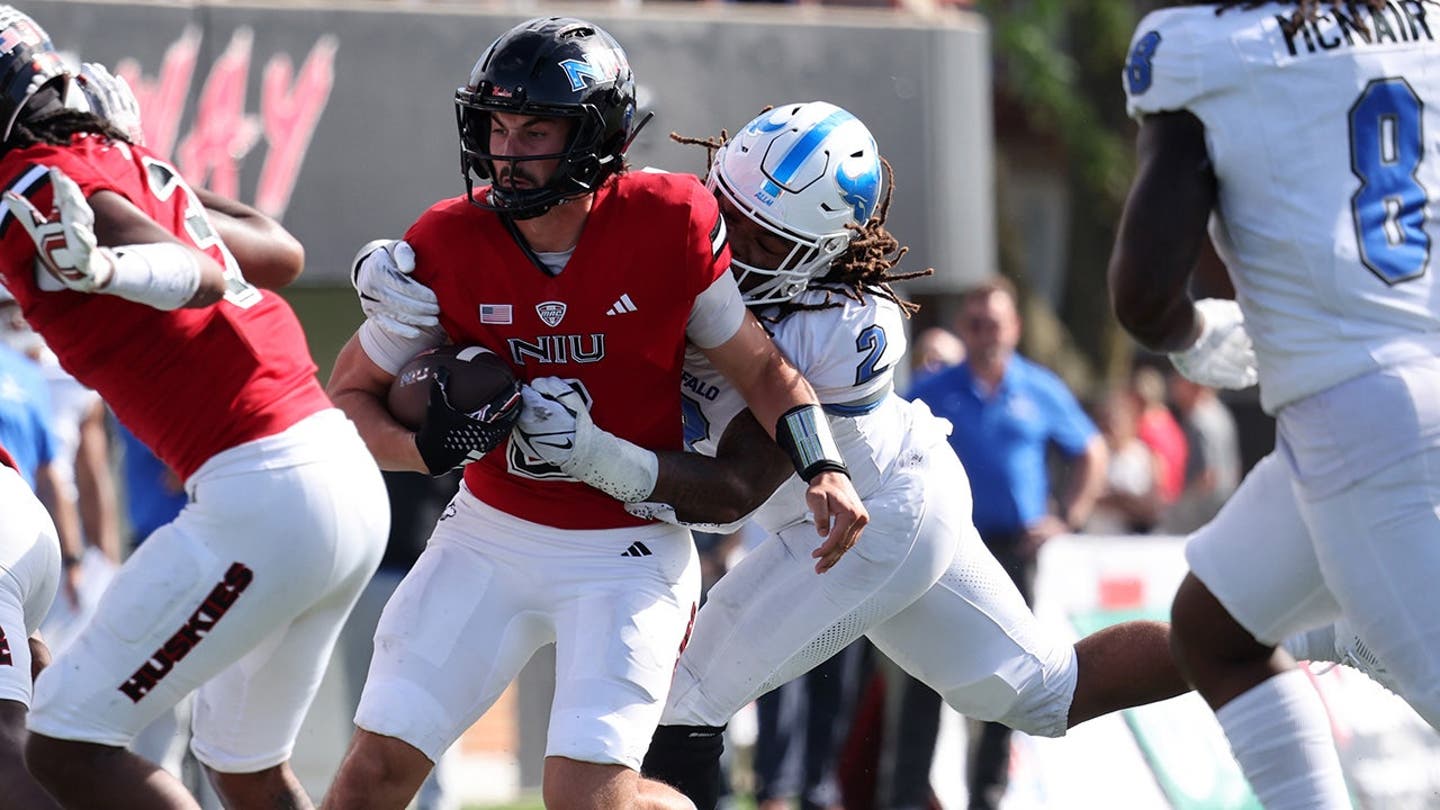 21 सितंबर, 2024 को हस्की स्टेडियम में पहले हाफ के दौरान नॉर्दर्न इलिनोइस हस्कीज़ क्वार्टरबैक एथन हैम्पटन (2) ने बफ़ेलो बुल्स लाइनबैकर रेड मर्डॉक (2) के खिलाफ गेंद फेंकी। (माइक डिनोवो/इमैगन इमेजेज)