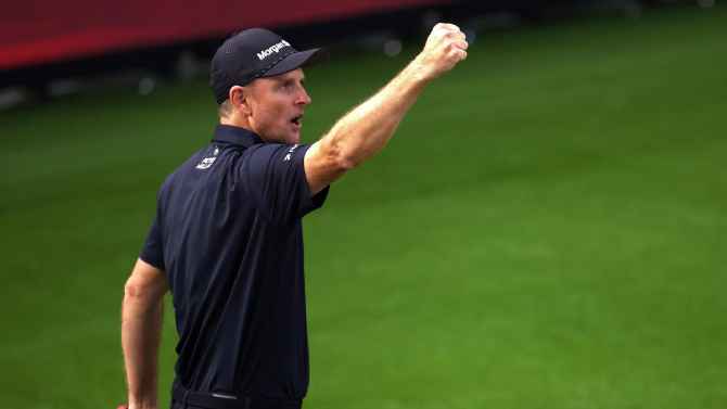 जस्टिन रोज़ ने टीजीएल फ़ाइनल में 8वां होल जीतने के लिए एलए गोल्फ क्लब के लिए 35 फीट से छलांग लगाई।