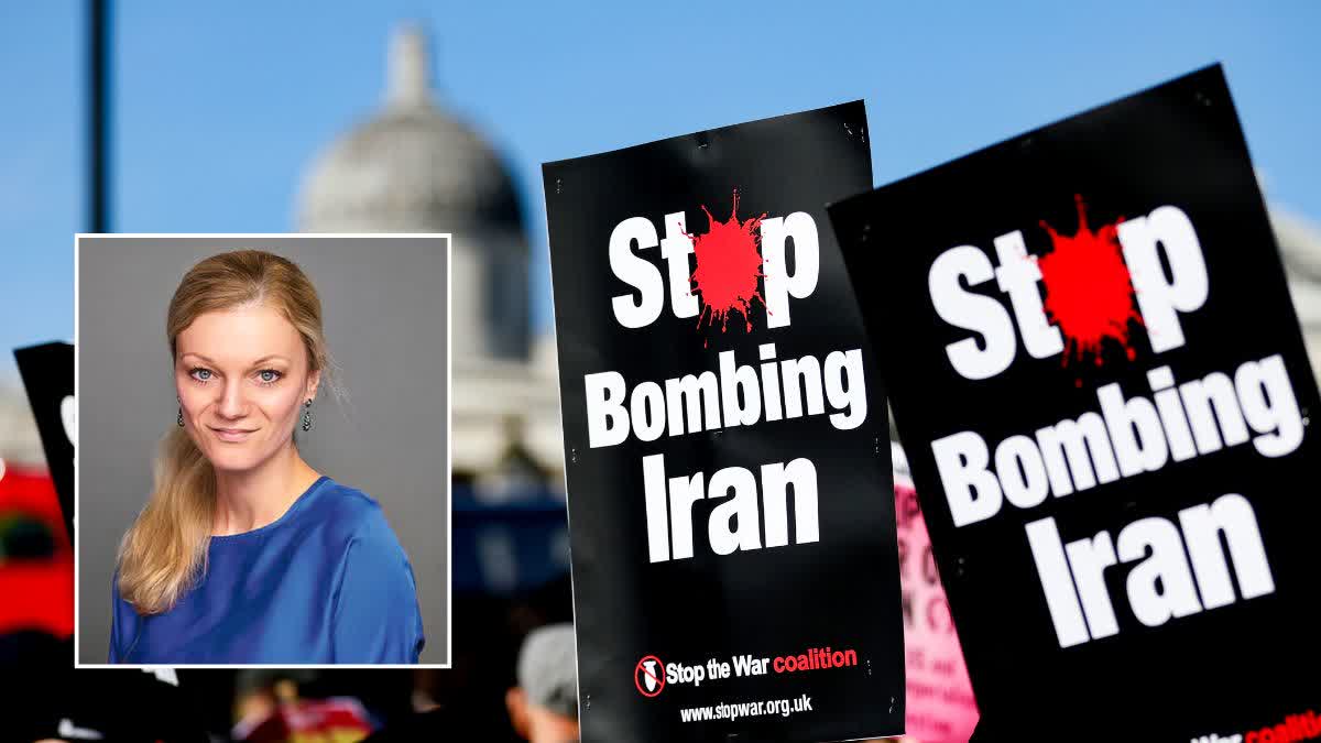 लंदन के ट्राफलगर स्क्वायर पर ईरान पर अमेरिकी-इजरायल युद्ध के खिलाफ विरोध प्रदर्शन, और (इनसेट) जेनिना डिल (आईएएनएस और ईटीवी भारत)