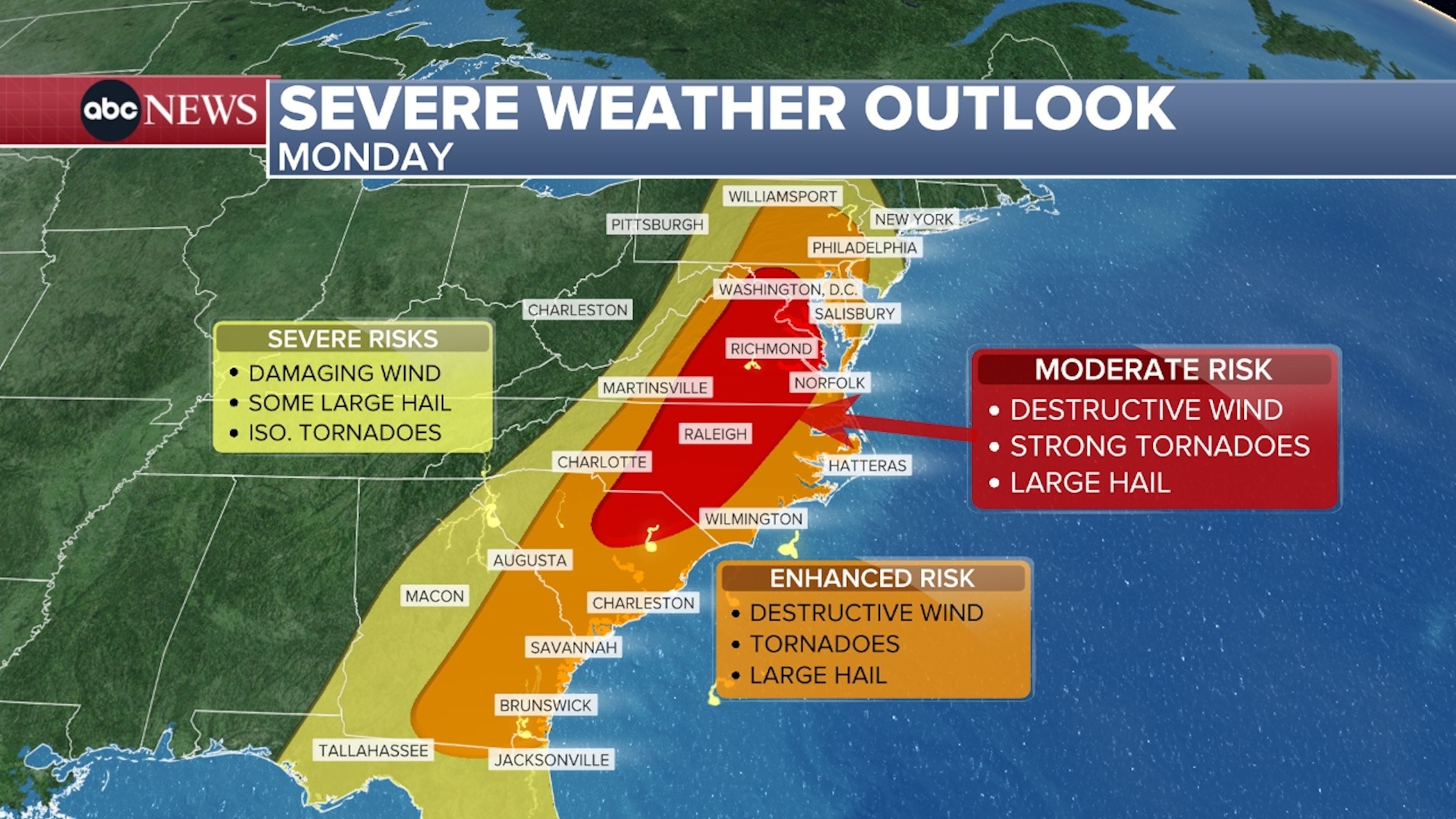 सोमवार को, वाशिंगटन, डीसी, रिचमंड और रैले शहरों सहित दक्षिण कैरोलिना, उत्तरी कैरोलिना, वर्जीनिया और मैरीलैंड तक गंभीर तूफान का मध्यम जोखिम फैलने का अनुमान है।