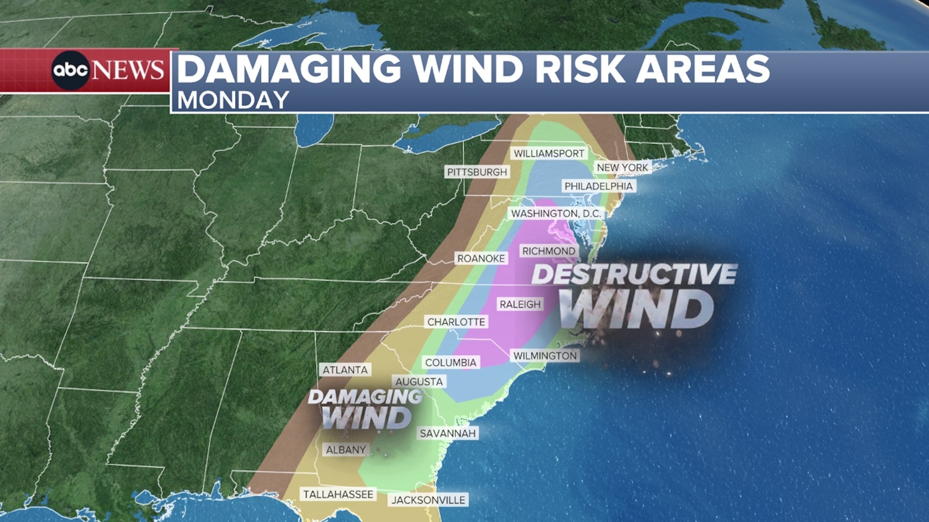 सवाना, चार्ल्सटन, चार्लोट, बाल्टीमोर और फिलाडेल्फिया शहरों सहित जॉर्जिया से पेंसिल्वेनिया तक भी गंभीर तूफान आने की आशंका है। इन क्षेत्रों में, विशेष रूप से दक्षिण कैरोलिना से मैरीलैंड तक, 70 मील प्रति घंटे से अधिक की विनाशकारी हवाएँ चल सकती हैं।