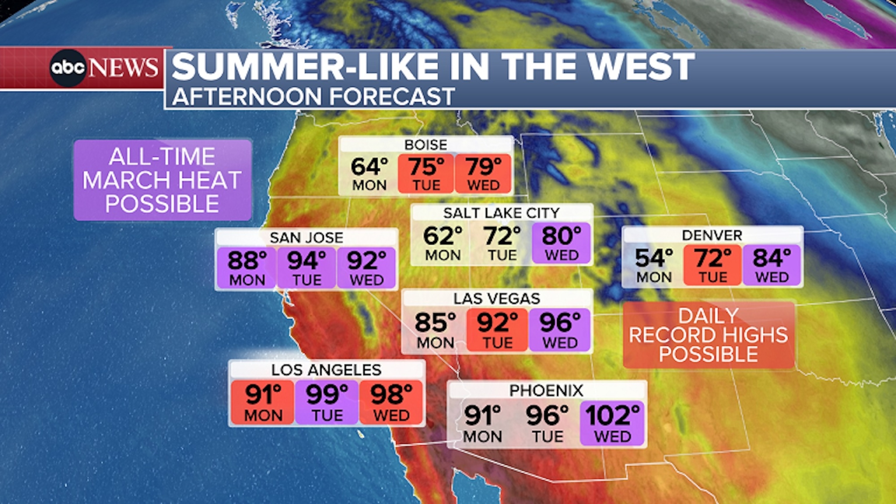 पूरे पश्चिम में कई शहर – सैक्रामेंटो, सैन जोस, लास वेगास, फीनिक्स और डेनवर – मार्च में सर्वकालिक उच्च तापमान तक पहुंच सकते हैं।