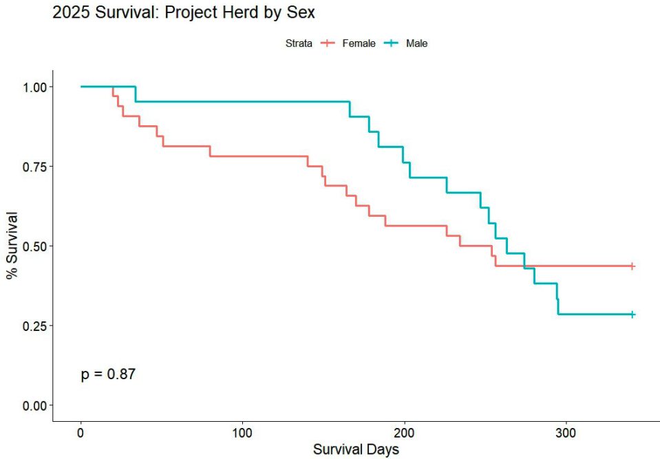 रिवर्टन बैठक में, ग्रेगरी ने उन 18 शिकारियों को घुमाया, जिन्होंने प्रोजेक्ट हर्ड पर नवीनतम डेटा के माध्यम से भाग लिया था। 2025 की शुरुआत में जीवित 53 कॉलर वाले खच्चर हिरणों की दुर्दशा ने कहानी बताई: वर्ष के अंत में केवल 29% हिरन और 44% हिरण अपने पैरों पर खड़े रहे। बाकी सब खत्म हो गया